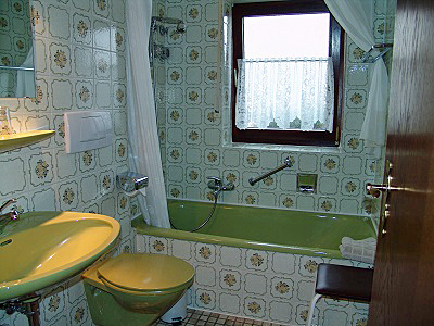und Kaffeemaschine. Das Bad ist mit Badewanne, Duscharmatur, WC und