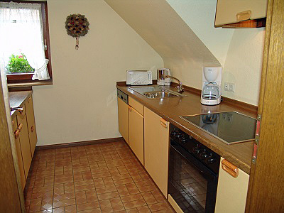Schlafsofa und separater, gut ausgestatteter Küche mit Geschirrspüler